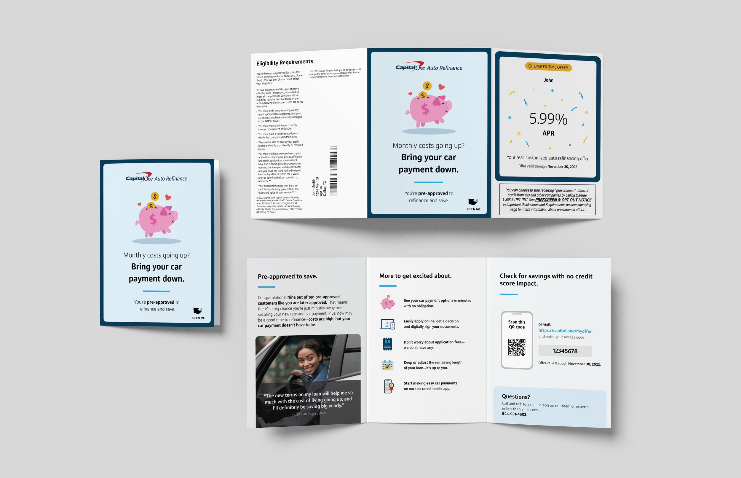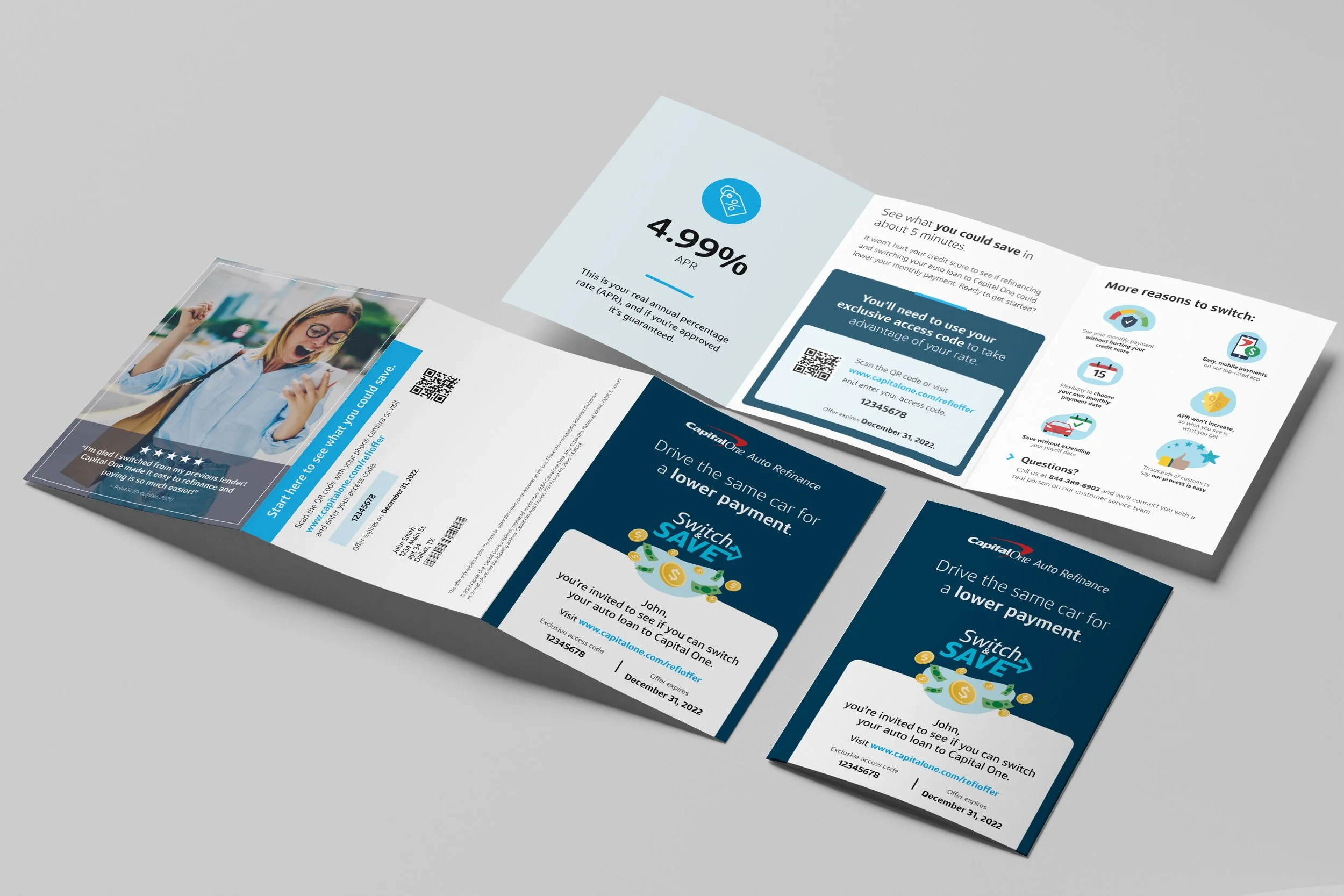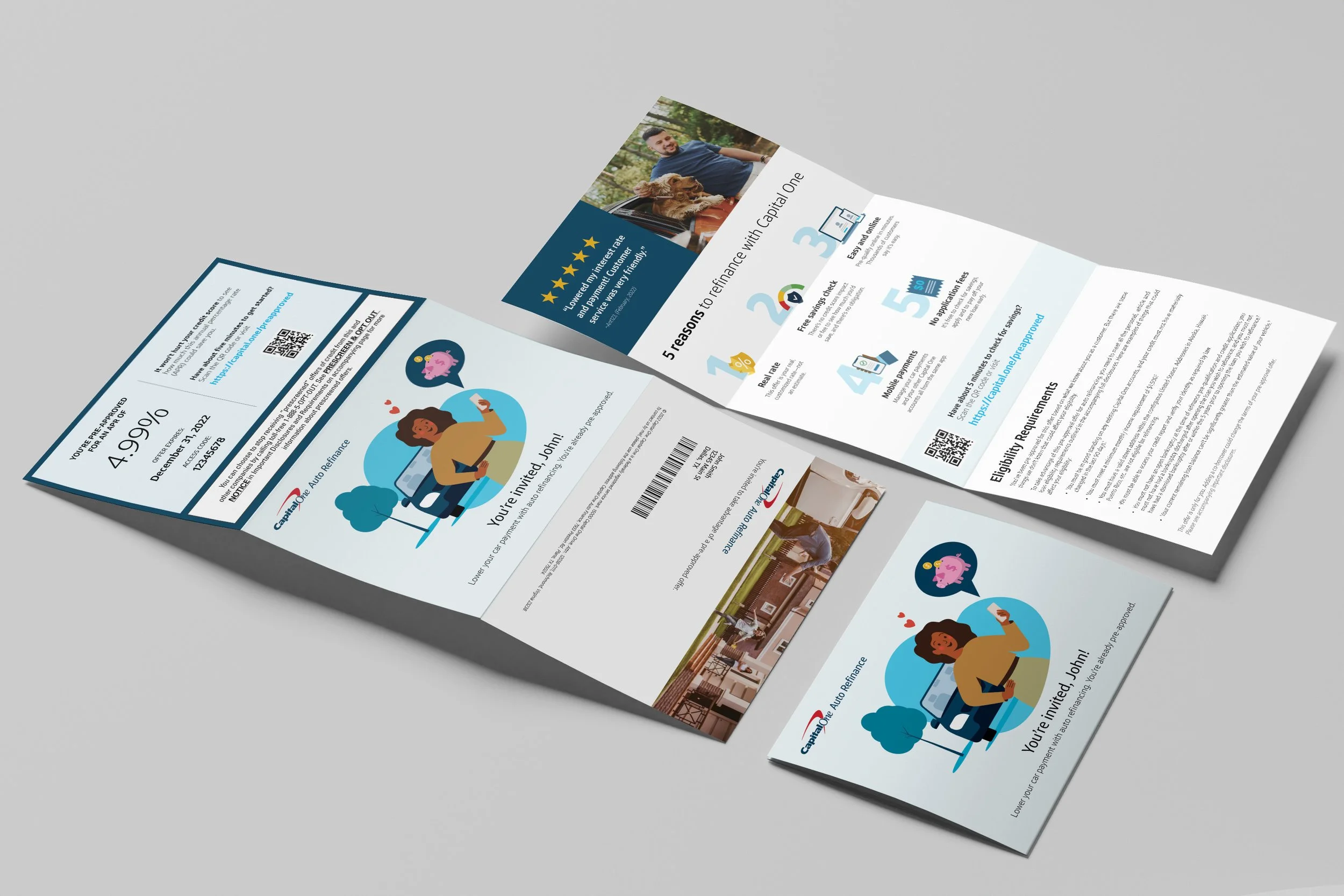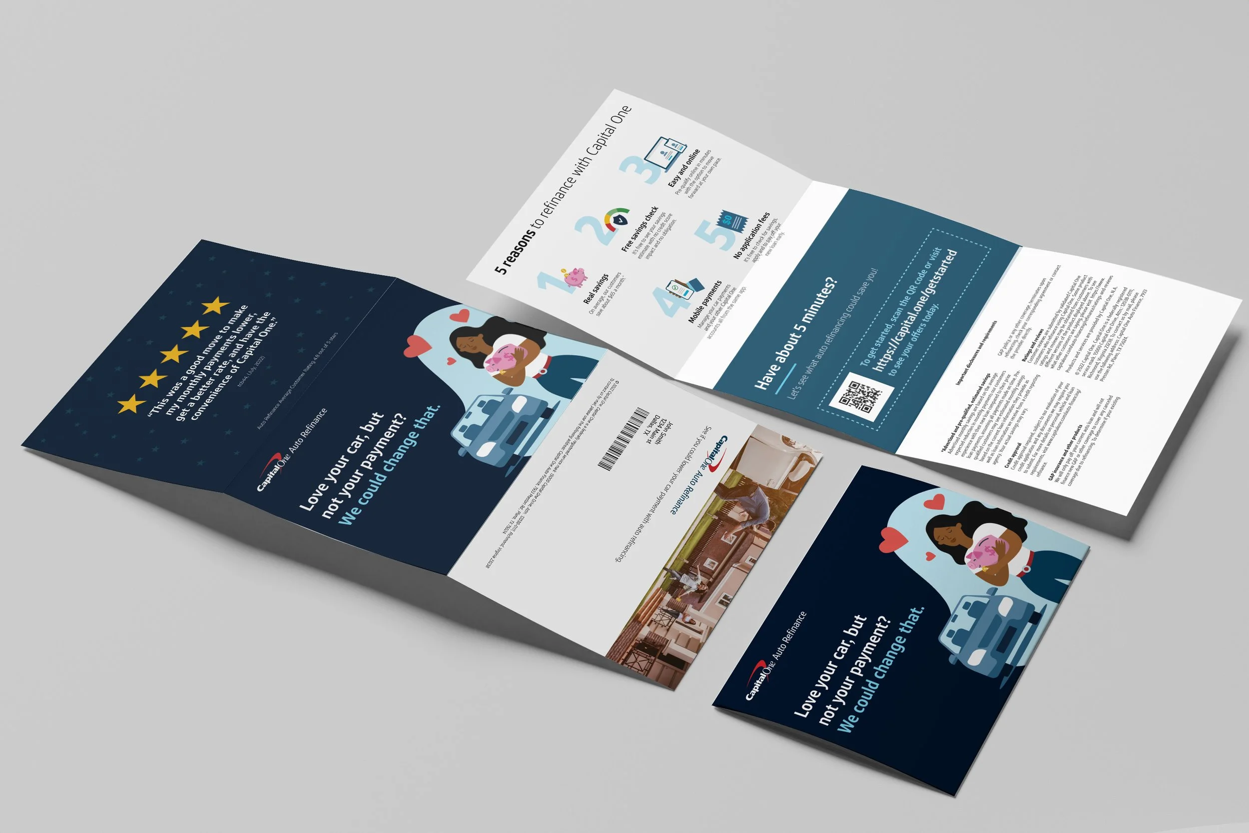 As both Art Director and later Creative Director, I led the concepting, design, and execution of Capital One Auto Refinance direct mail campaigns reaching millions of customers nationwide. Each piece was built around data-driven insights and rigorous testing strategy — aligning creative direction with business goals to drive response and conversion. I collaborated closely with analytics, marketing, and compliance partners to ensure every element struck the right balance between performance, clarity, and brand consistency. From creative testing frameworks to production-ready design systems, these campaigns exemplified how thoughtful, insight-led creative can deliver both strategic and visual impact.